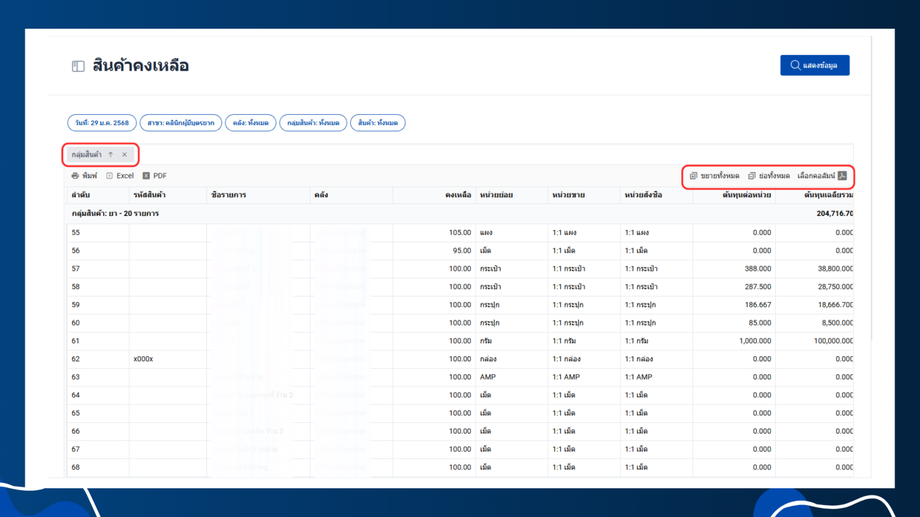 - สาขา คลัง กลุ่มสินค้า ตรวจสอบยอดคงเหลือ และสินค้า