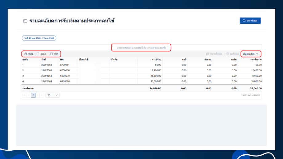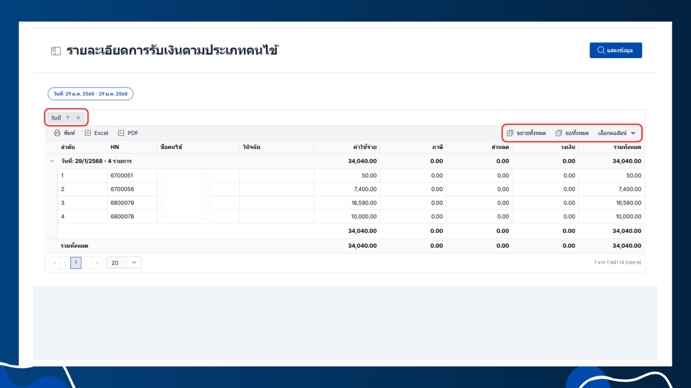 - โดยจะแสดงรายละเอียดการรับเงินตามประเภทคนไข้ ตามที่ผู้ใช้เลือกวันที่และเลือกประเภทลูกค้าข้างต้น
