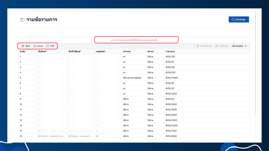 - ลากส่วนหัวของคอลัมน์เพื่อจัดกลุ่มตามคอลัมน์นั้นๆที่ต้องการดูได้