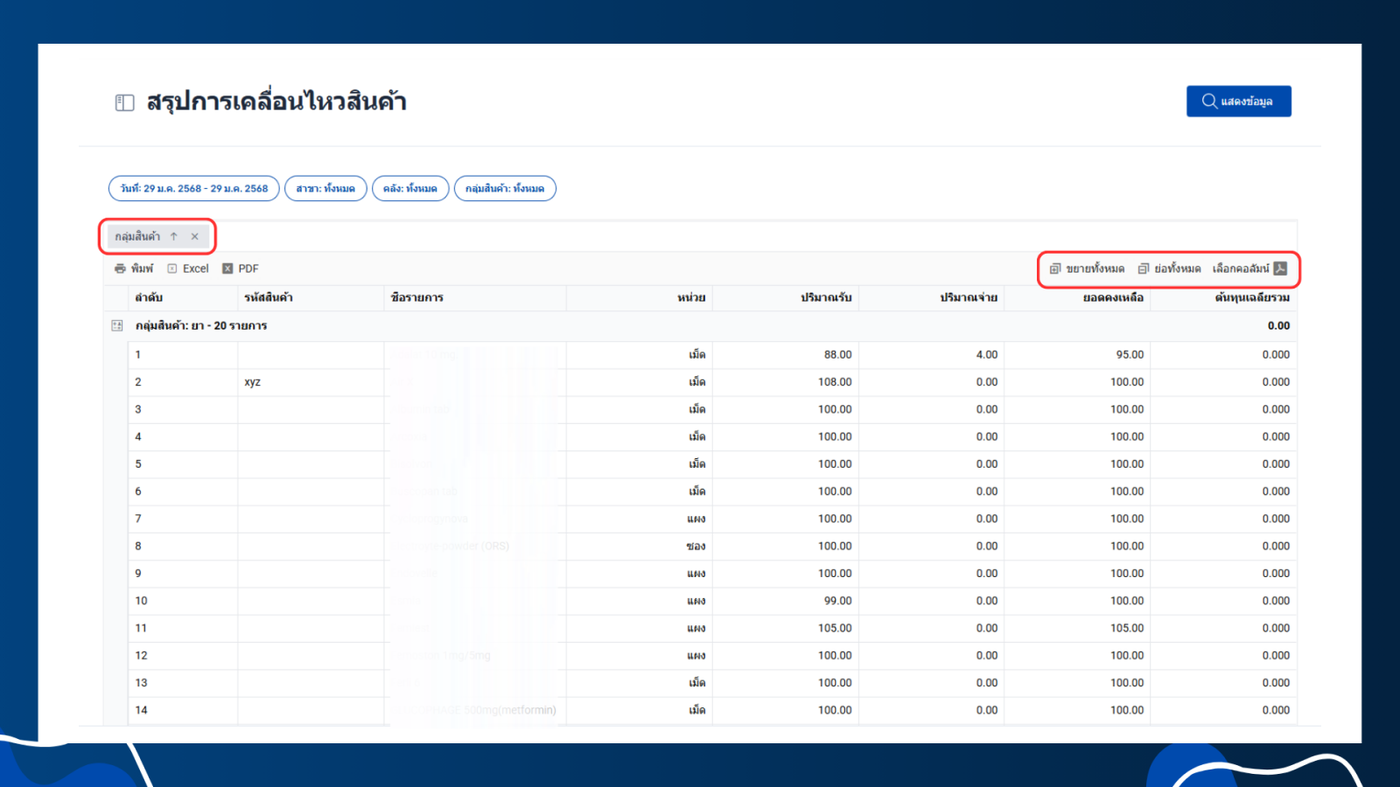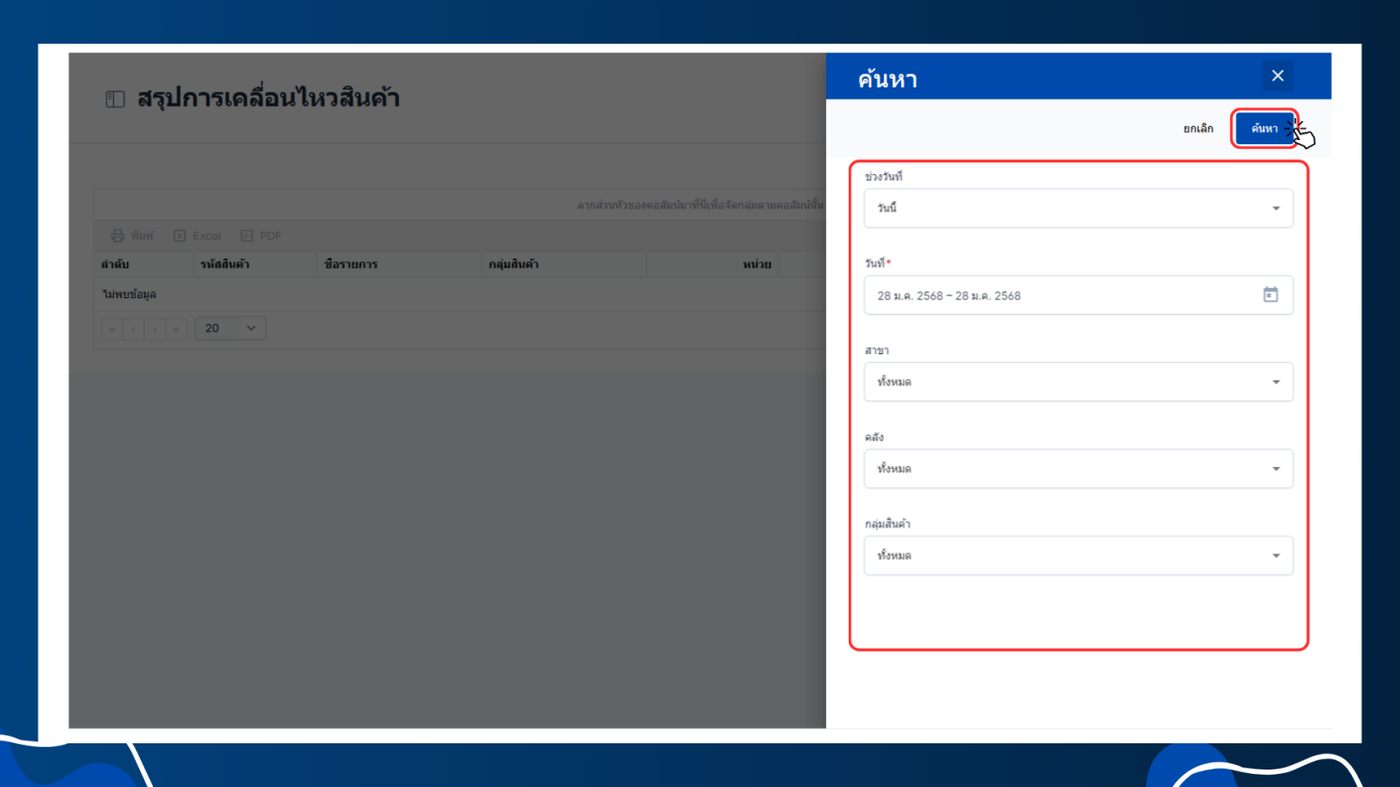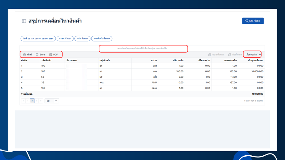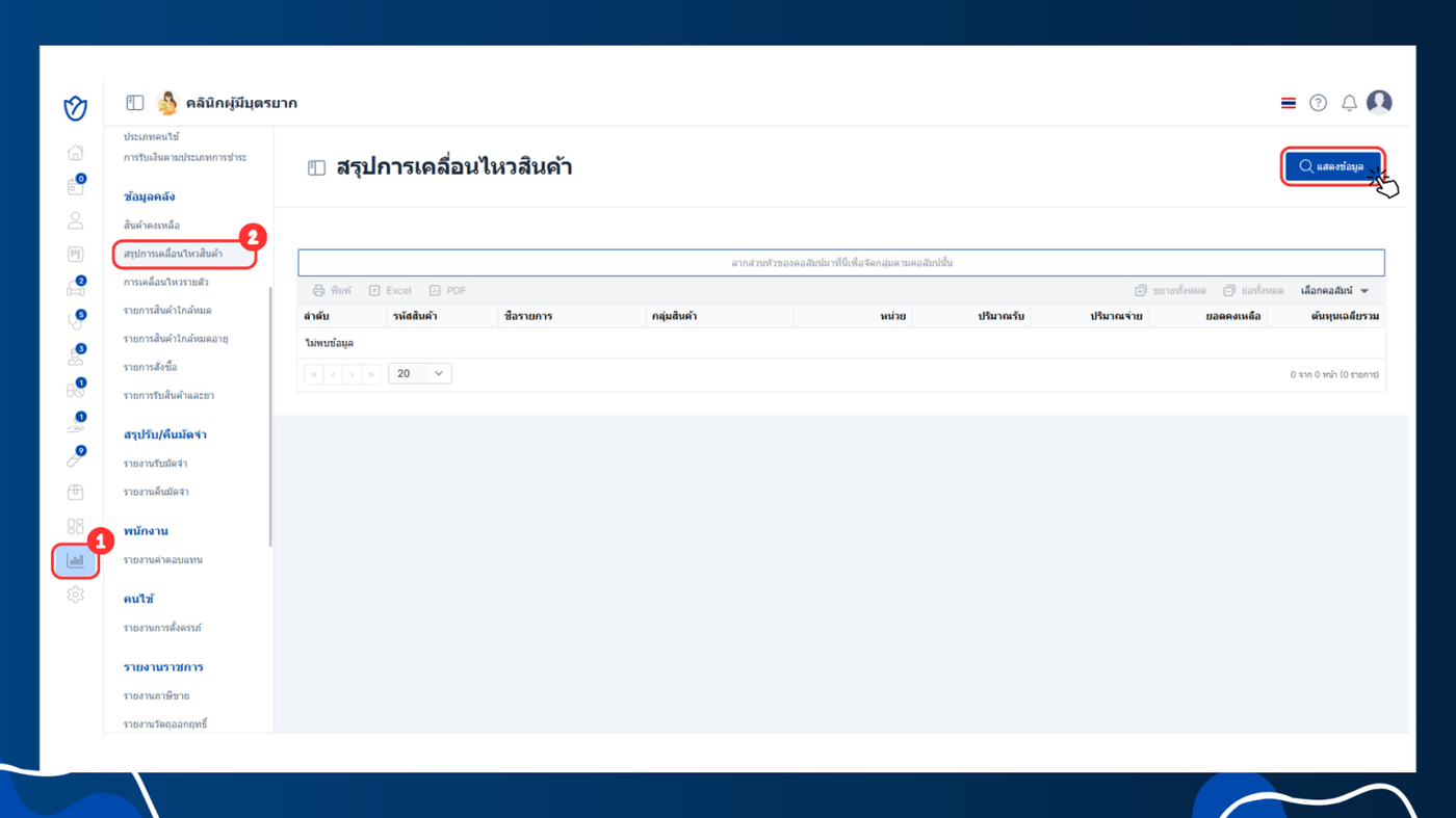 - เลือกหัวข้อข้อมูลคลัง > สรุปการเคลื่อนไหวสินค้า