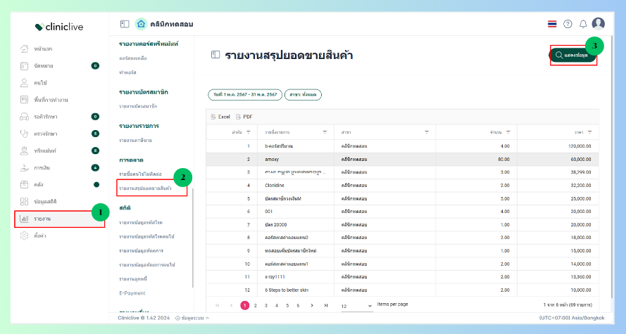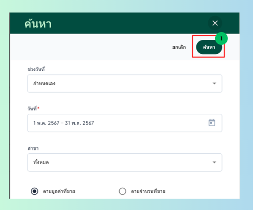 วิธีแสดงรายงานสรุปยอดขายสินค้า เลือกหัวข้อรายงาน เลือกหัวข้อรายงานสรุปยอดขายสินค้า คลิกที่แสดงข้อมูล เลือกช่วงวันที่ เลือกวันที่ เลือกสาขา กดค้นหา **ต้องเปิดสิทธ์การใช้งานในเมนูตั้งค่าสิทธิ์การใช้งานรายงานการตลาดก่อน**