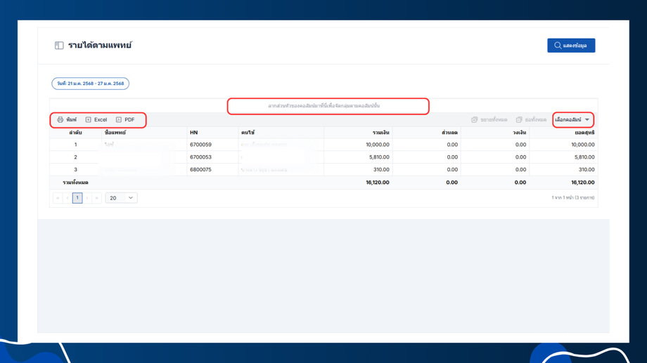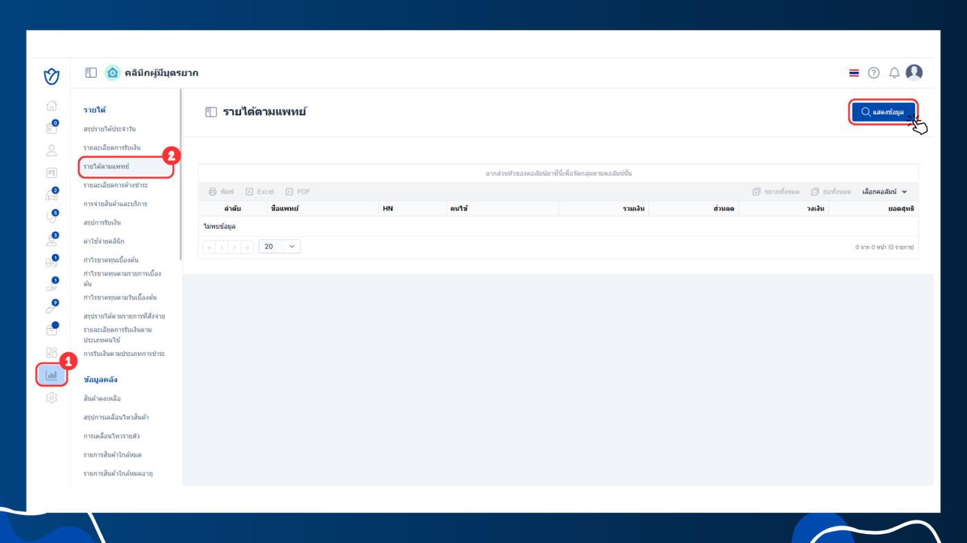 - เลือกหัวข้อรายได้ > รายได้ตามแพทย์