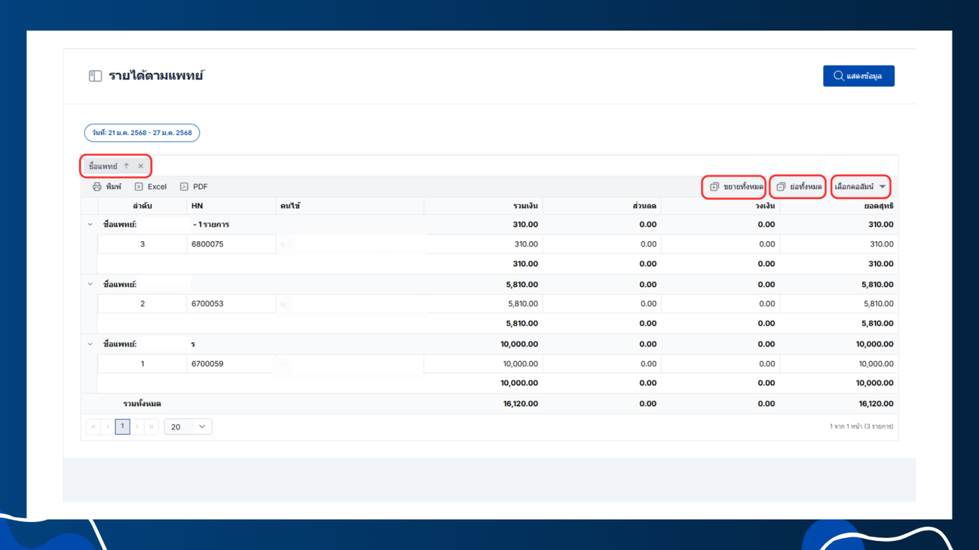 - เมื่อลากส่วนหัวของคอลัมน์เพื่อจัดกลุ่มได้แล้วจะแสดงข้อมูลตามนี้ตัวอย่างเช่น เลือกชื่อแพทย์