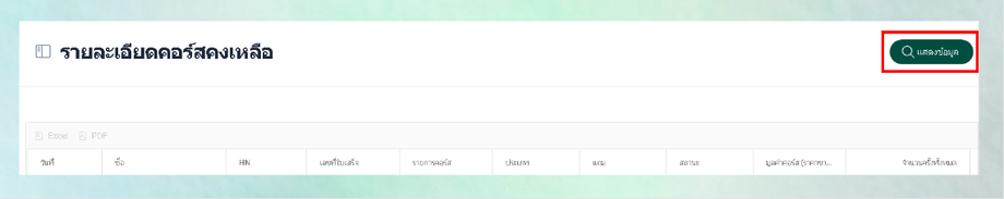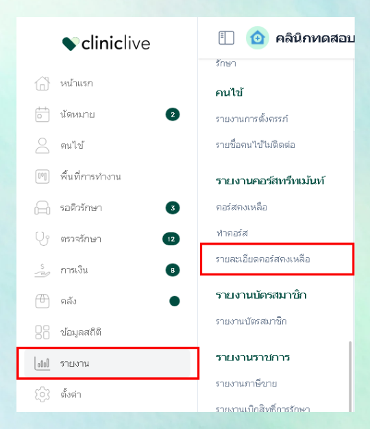 รายละเอียดคอร์สคงเหลือเป็นรายงานที่แสดงข้อมูลสำคัญเกี่ยวกับคอร์สที่คนไข้ยังคงเหลือในระบบของคลินิก รายงานนี้เสริมทำให้ผู้ดูแลระบบหรือเจ้าหน้าที่ทางการแพทย์สามารถติดตามและวิเคราะห์สถานะและข้อมูลที่เกี่ยวข้องกับคอร์สที่คนไข้ยังคงเหลือในระบบ