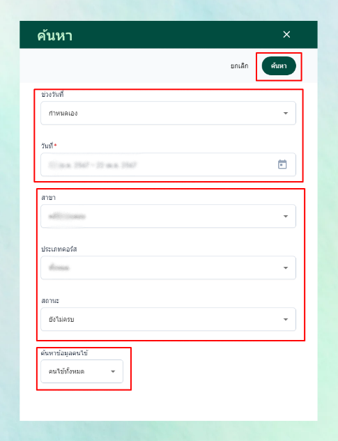 - เลือก สาขา, ประเภทคอร์ส (คอร์สครั้งหรือคอร์สปริมาณ), สถานะ และข้อมูลลูกค้า