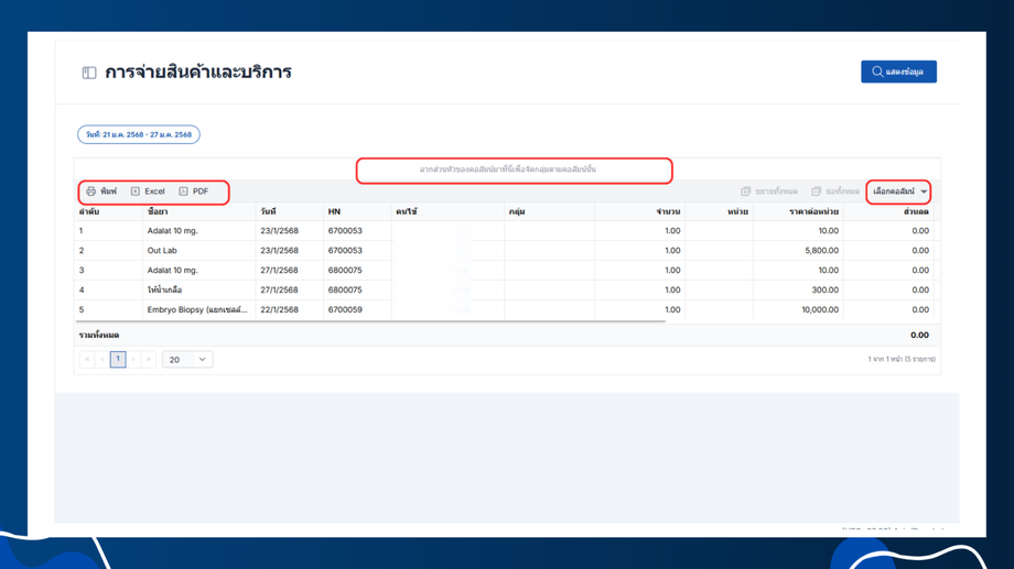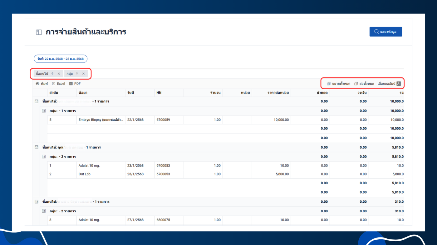 - เมื่อลากส่วนหัวของคอลัมน์เพื่อจัดกลุ่มได้แล้วจะแสดงข้อมูล ตัวอย่าง ดึงชื่อคนไข้และกลุ่ม