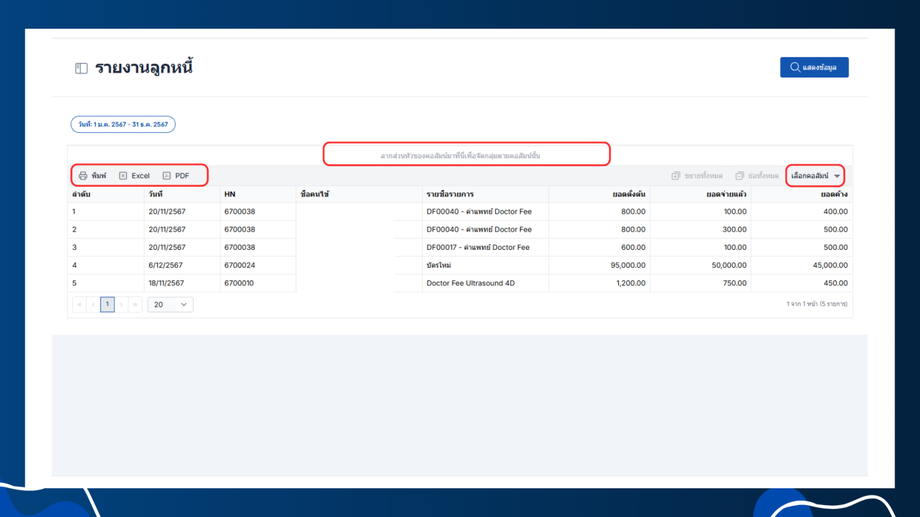 - ลากส่วนหัวของคอลัมน์เพื่อจัดกลุ่มตามคอลัมน์นั้นๆที่ต้องการดูได้