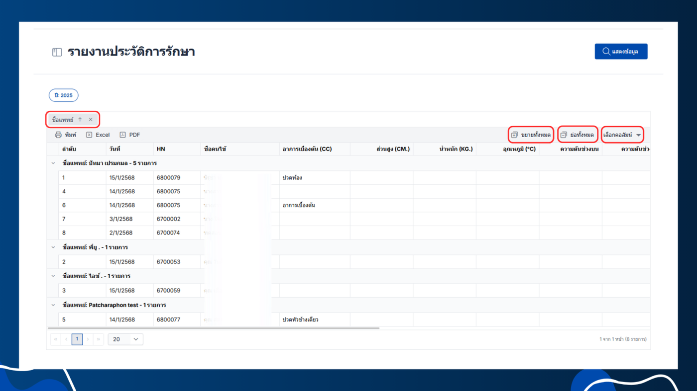 - เมื่อลากส่วนหัวของคอลัมน์เพื่อจัดกลุ่มได้แล้วจะแสดงข้อมูลตามนี้ตัวอย่างเช่น เลือกหัวข้อชื่อแพทย์