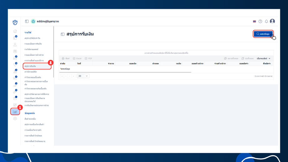 - เลือกหัวข้อรายได้ > สรุปการรับเงิน