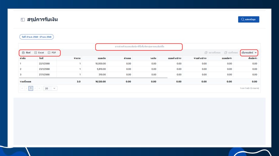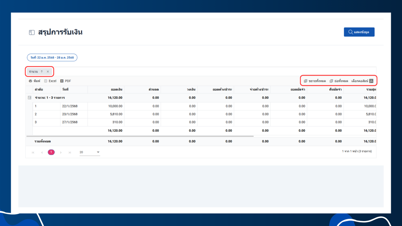 สรุปการรับเงิน คือ รายงานหรือข้อมูลที่แสดงรายละเอียดเกี่ยวกับยอดเงินที่ได้รับเข้ามาในช่วงระยะเวลาที่กำหนด โดยรายงานนี้จะแสดงข้อมูลต่างๆเช่น วันที่ จำนวน ยอดเงิน ส่วนลด วงเงิน ยอดค้างชำระ จ่ายค้างชำระ ยอดมัดจำ คืนมัดจำ รวมสุทธิ เงินสด บัตรเครดิต คูปอง เงินโอน รายรับรวม