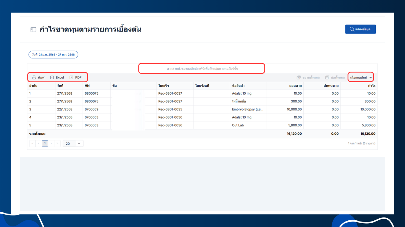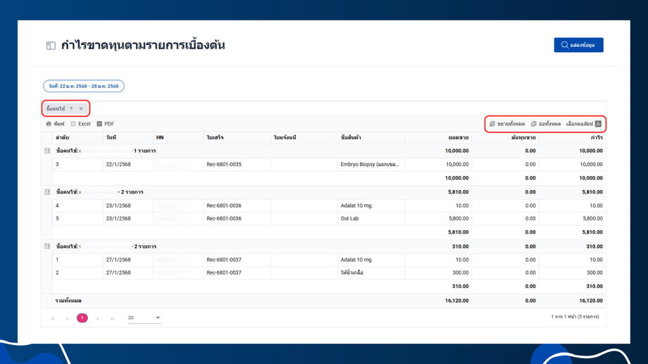 - เลือกหัวข้อรายได้ > กำไรขาดทุนตามรายการเบื้องต้น