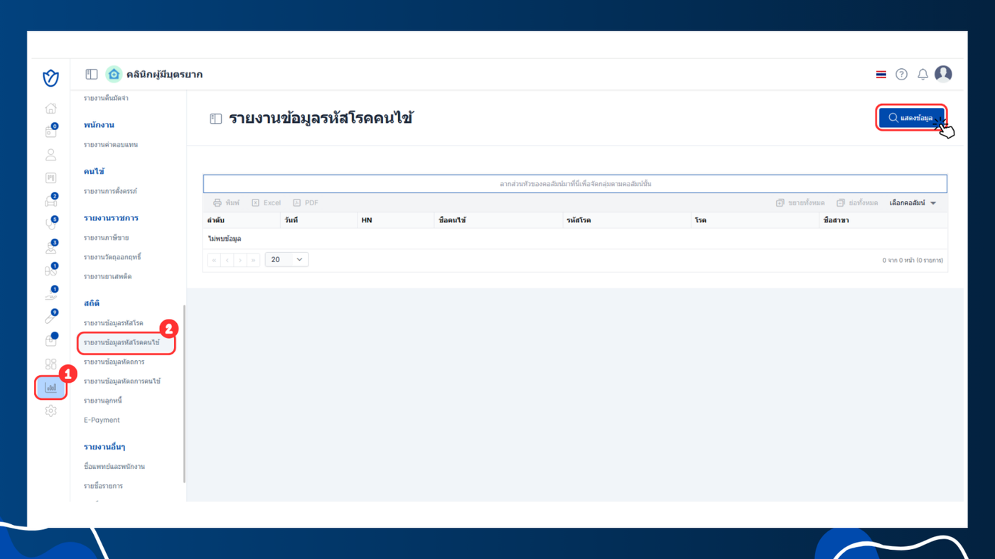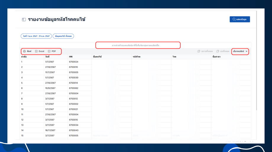 รายงานนี้เสริมทำให้ผู้ดูแลระบบหรือเจ้าหน้าที่สามารถกรองข้อมูลรหัสโรคคนไข้ของคลินิกตามความต้องการเพื่อให้ได้ข้อมูลที่ต้องการ