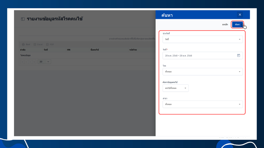 - ค้นหาข้อมูลคนไข้ หรือเลือกทั้งหมด