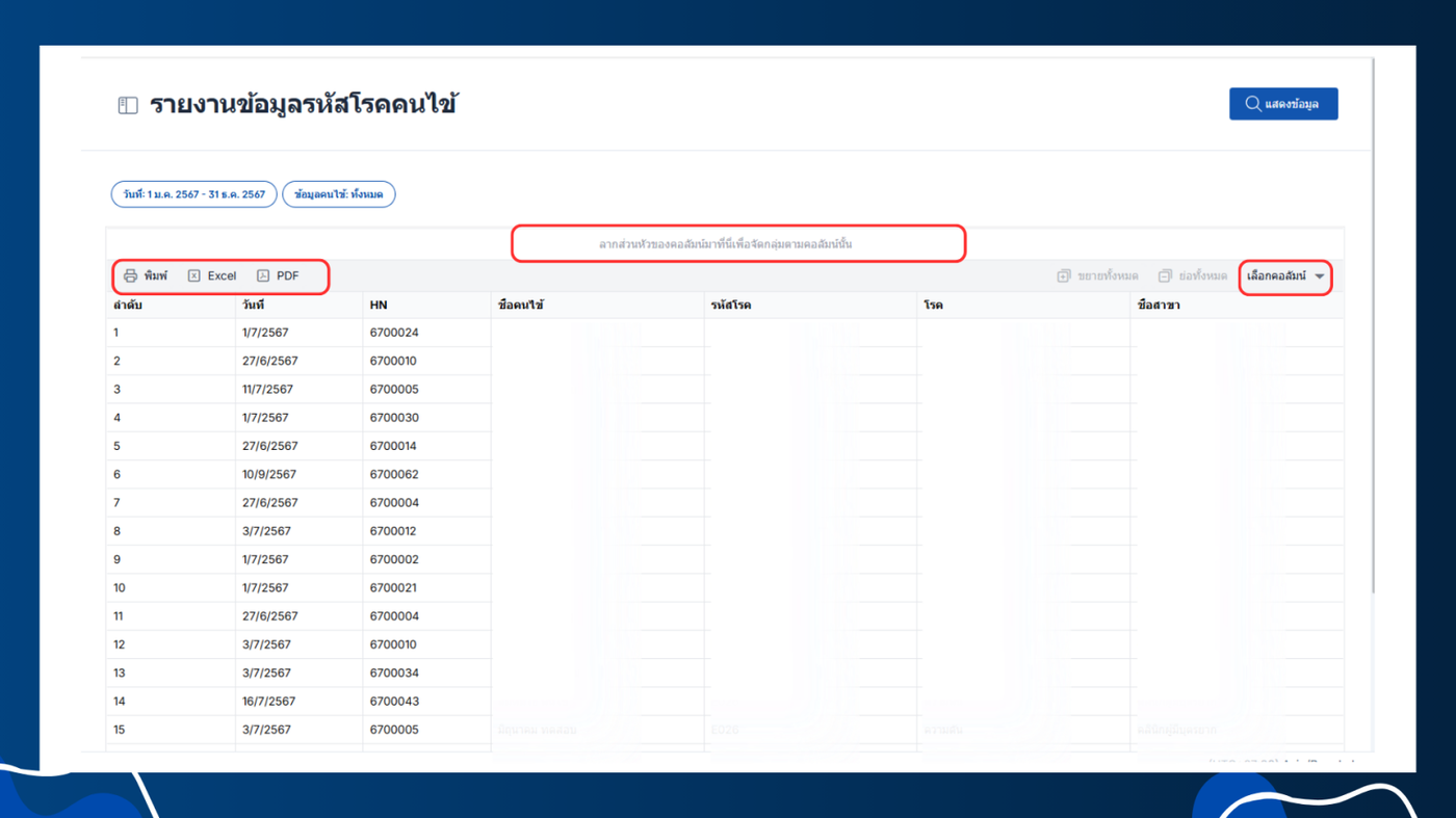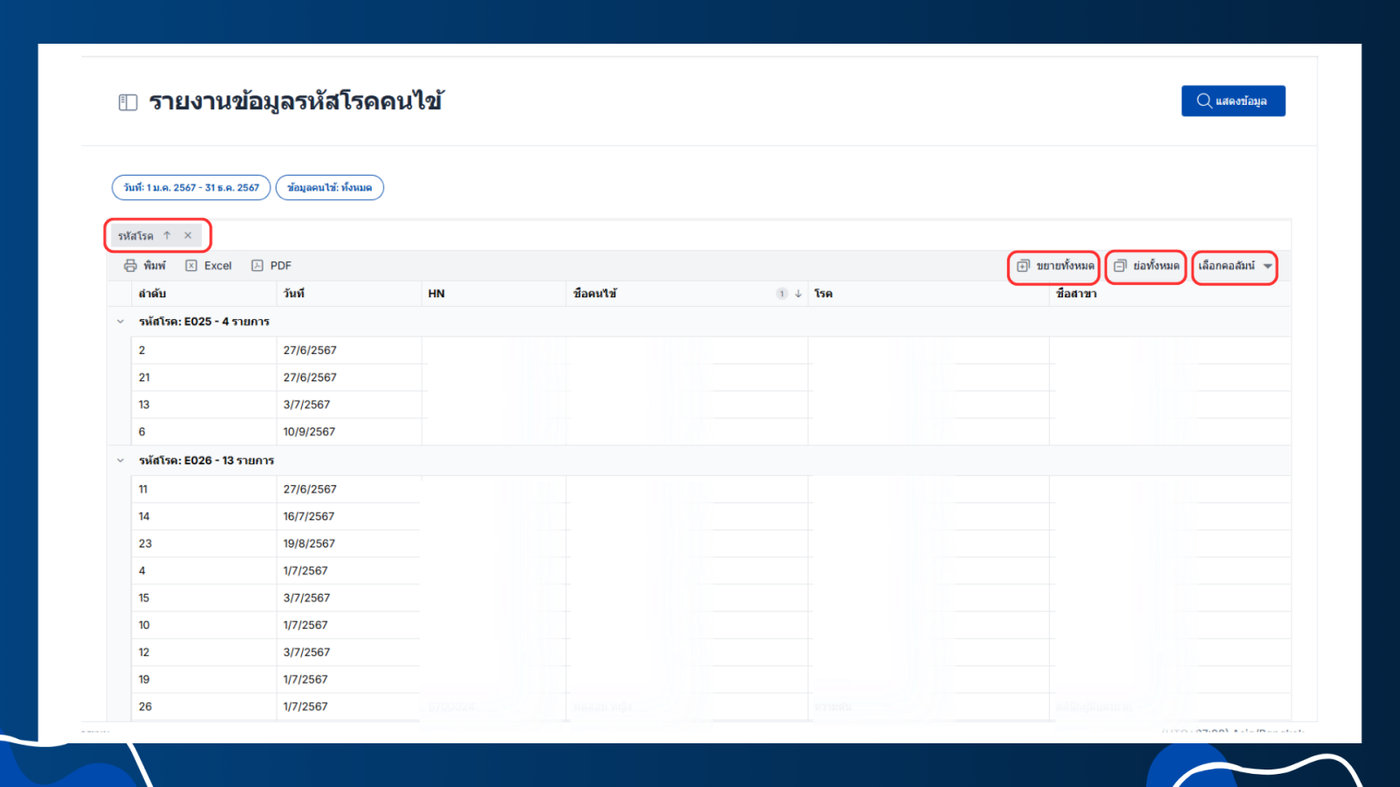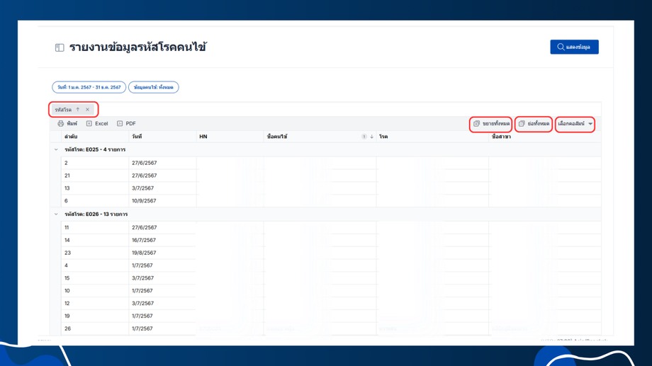 - เมื่อลากส่วนหัวของคอลัมน์เพื่อจัดกลุ่มได้แล้วจะแสดงข้อมูลตามนี้ตัวอย่างเช่น เลือกรหัสโรค