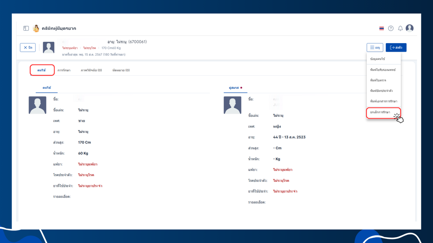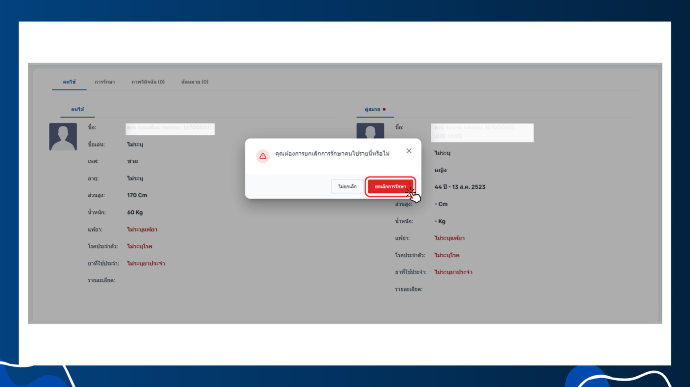 - เลือกคนไข้ที่ต้องการทำการยกเลิกการรักษา