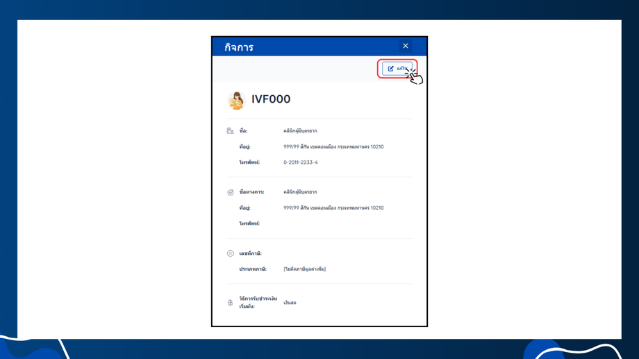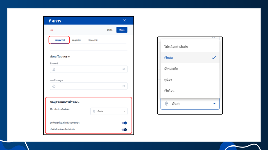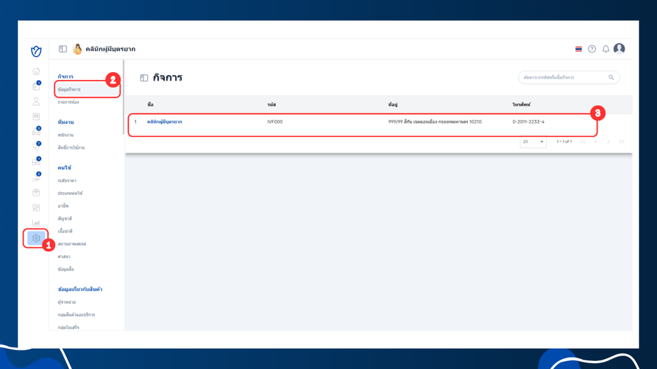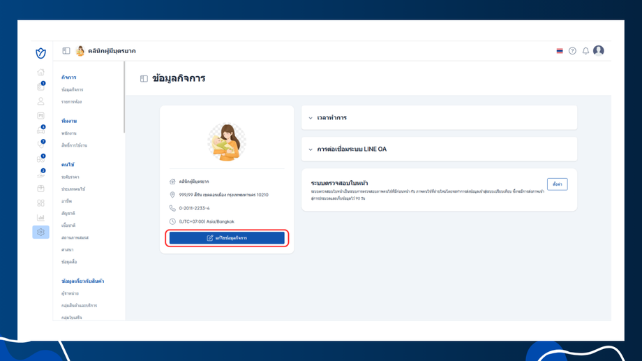 ในการตั้งค่าข้อมูลกิจการ วัตถุประสงค์เพื่อบันทึกข้อมูลที่จำเป็นของกิจการ โดยประกอบด้วย ข้อมูลคลินิก, ข้อมูลภาษีของคลินิก, ข้อมูลใบอนุญาต, ระบบการชำระเงิน, ข้อมูลกิจการ และขั้นตอนการยกเลิกใช้งาน