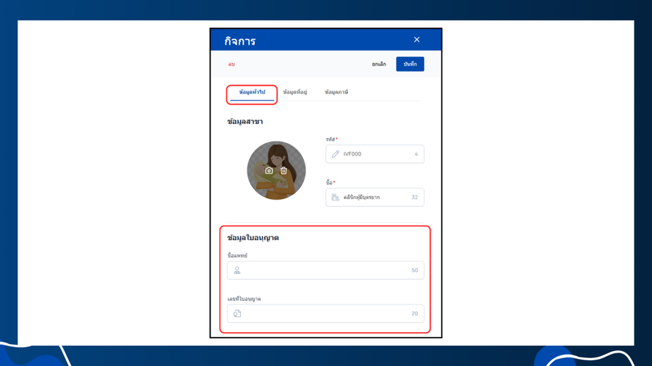 - เมื่อเข้าสู่หน้าการแก้ไขกิจการแล้ว ให้เลือกหัวข้อ "ข้อมูลทั่วไป" จากนั้นกรอกข้อมูลในช่อง ชื่อแพทย์ และเลขที่ใบอนุญาต