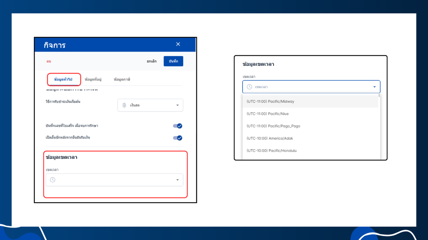 - เมื่อเข้าถึงหน้าการแก้ไขกิจการแล้ว ให้เลือกหัวข้อ "แก้ไข" และเลือก "ข้อมูลทั่วไป" จากนั้นคลิกที่ Drop-down เลือกเขตเวลาที่ต้องการ