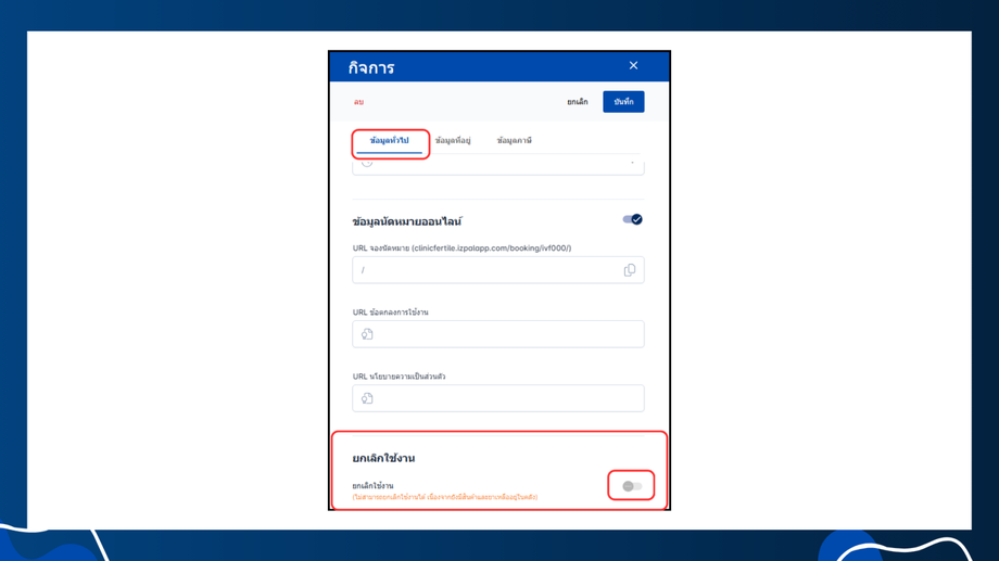 - หากผู้ใช้งานต้องการยกเลิกใช้งาน เมื่อเข้าถึงหน้าการแก้ไขข้อมูลกิจการแล้ว คลิกไปที่ "แก้ไข" เลือกหัวข้อ "ข้อมูลทั่วไป" จากนั้นเลื่อนลงมาจะเห็นหัวข้อ "ยกเลิกใช้งาน" สามารถเปิดปิดการยกเลิกใช้งานได้