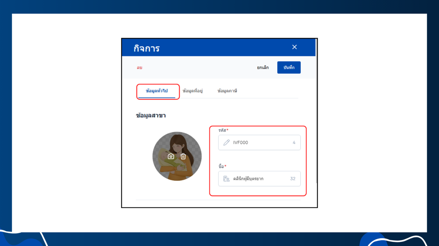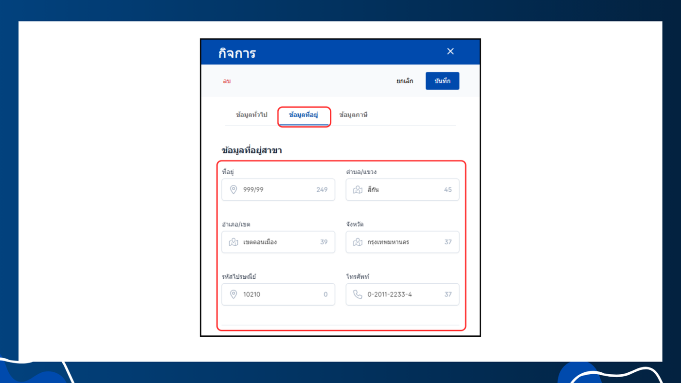 ส่วนนี้จะประกอบด้วยข้อมูลที่อยู่สาขาและข้อมูลที่อยู่กิจการ