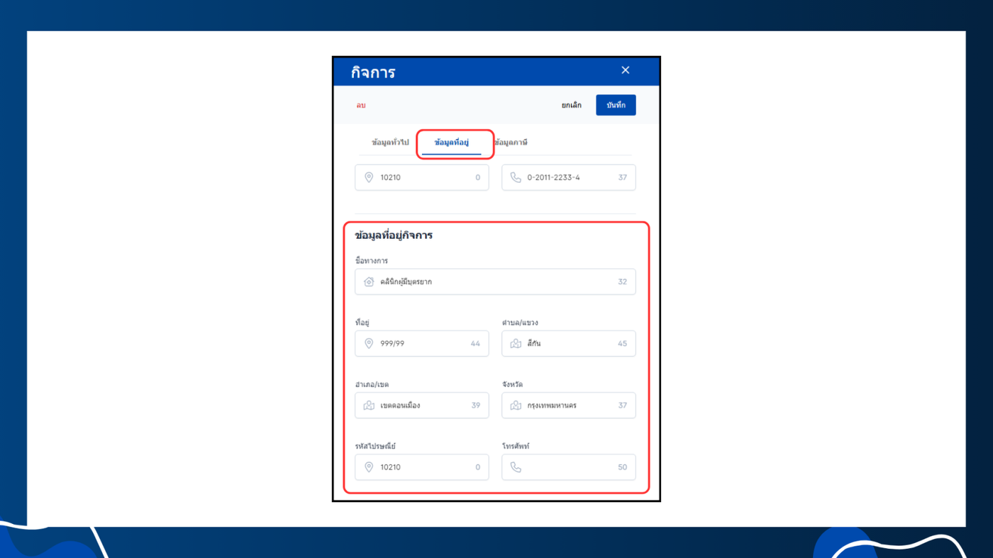 ข้อมูลที่อยู่กิจการ: กรอกข้อมูล