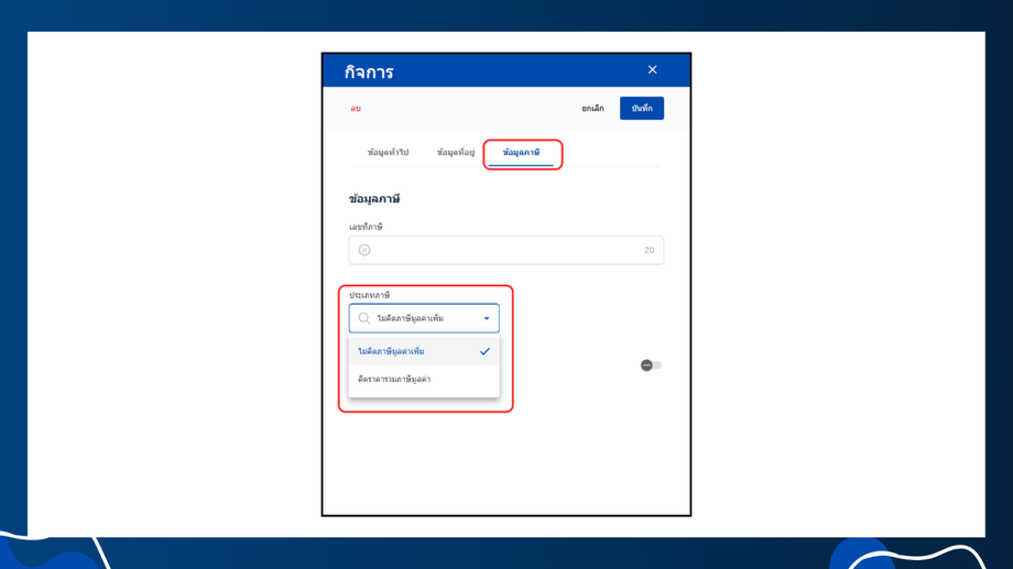 - ระเภทภาษี: เลือกประเภทภาษี หากเลือกไม่คิดภาษีมูลค่าเพิ่ม จะไม่แสดงในช่องอัตราภาษี