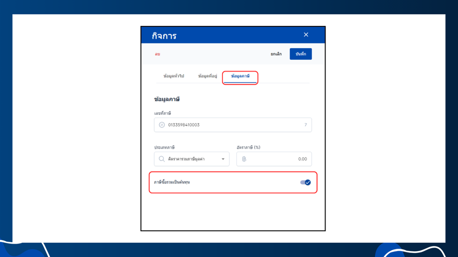 - เลขที่ภาษี: รหัสประจำตัวของแต่ละบุคคล หรือ นิติบุคคล ที่ใช้ในการยื่นเสียภาษี กรอกข้อมูล