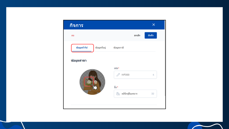 - การเพิ่มรูปภาพ: เมื่อเมาส์ชี้ที่รูปภาพจะมีไอคอนกล้องปรากฏขึ้นมา จากนั้นคลิกเลือกรูปภาพที่ต้องการ เมื่อเพิ่มรูปภาพเสร็จแล้ว จะไปแสดงในรายการพิมพ์เอกสาร เช่น ใบเสร็จ หรือ ใบรับรองแพทย์
