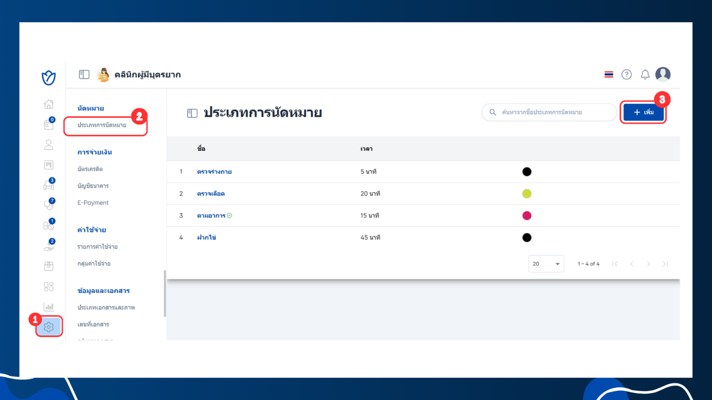 "เมื่อผู้ใช้งานเพิ่มตั้งค่าประเภทนัดหมายเรียบร้อย, ระบบจะใช้งานข้อมูลประเภทนัดหมายนี้ในขั้นตอนการเพิ่มนัดหมาย ทำให้ผู้ใช้สามารถเลือกประเภทนัดหมายที่ต้องการ