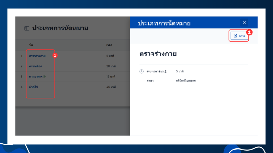 - เมื่อผู้ใช้อยู่ในหน้าประเภทการนัดหมาย เลือกการนัดหมายที่ต้องการแก้ไขจะมีหน้าต่างแสดงข้อมูลขึ้นมาเลือก"แก้ไข"