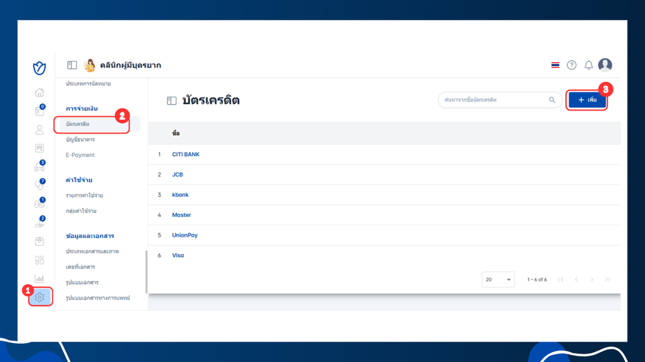 - เมื่อผู้ใช้เข้าสู่หน้าบัตรเครดิตคลิกที่เพิ่ม