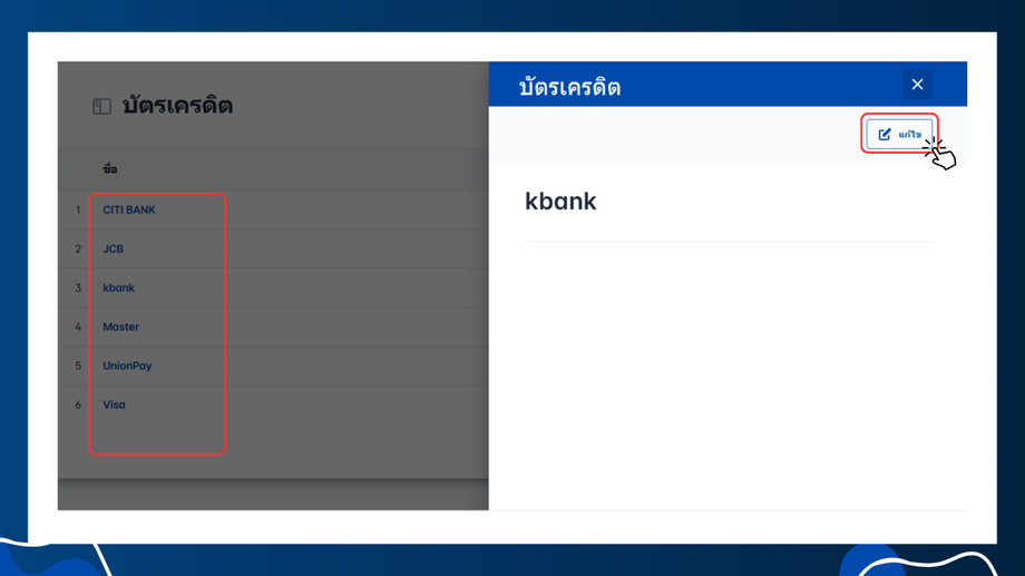 - เมื่อผู้ใช้งานเข้าถึงหน้าบัตรเครดิต เลือกบัตรเครดิตที่ต้องการแก้ไข จะมีหน้าต่างแสดงข้อมูลบัตรเครดิตขึ้นมา กดแก้ไข