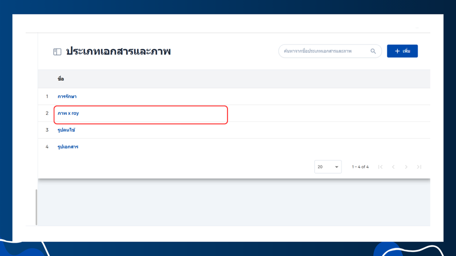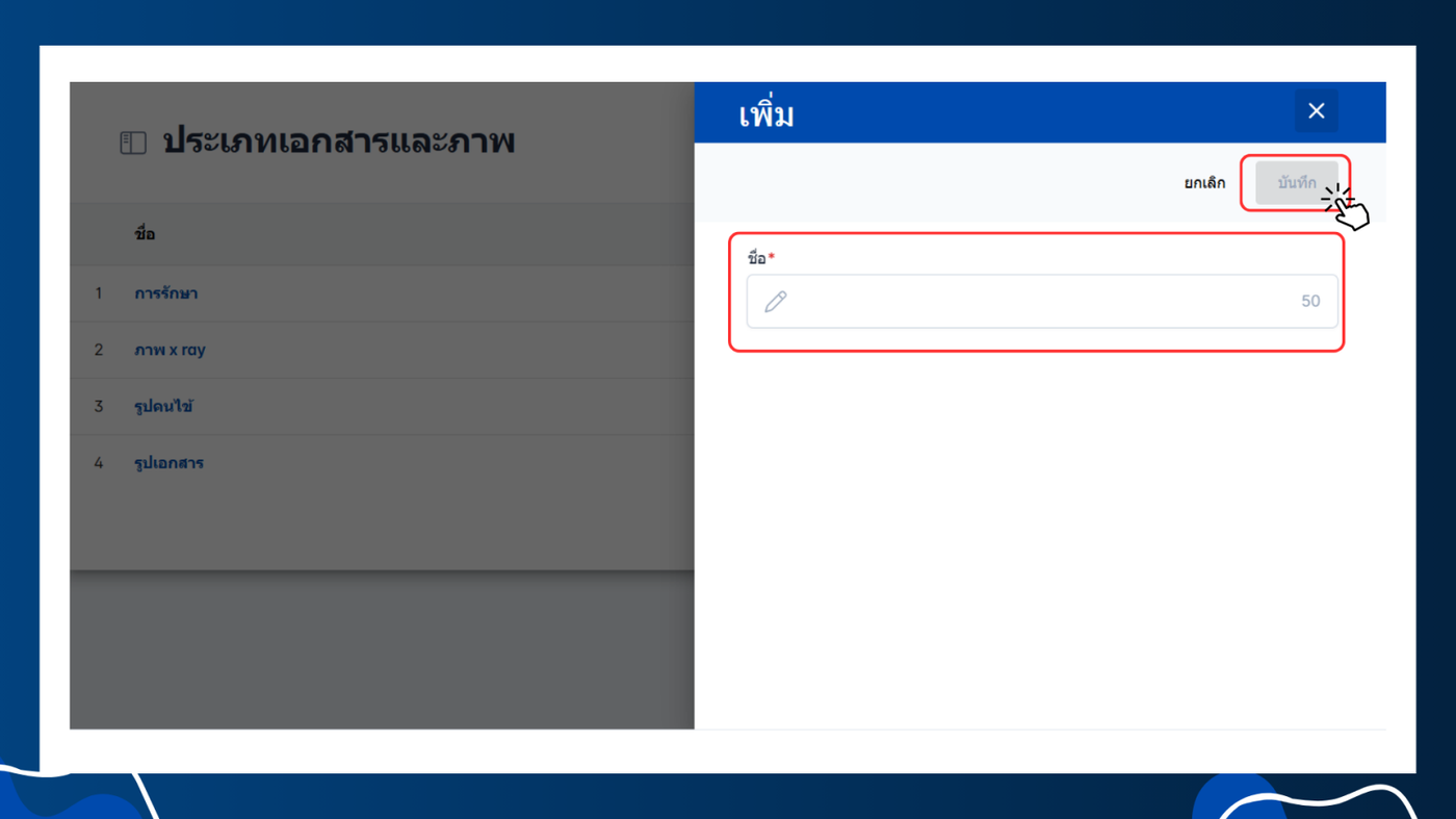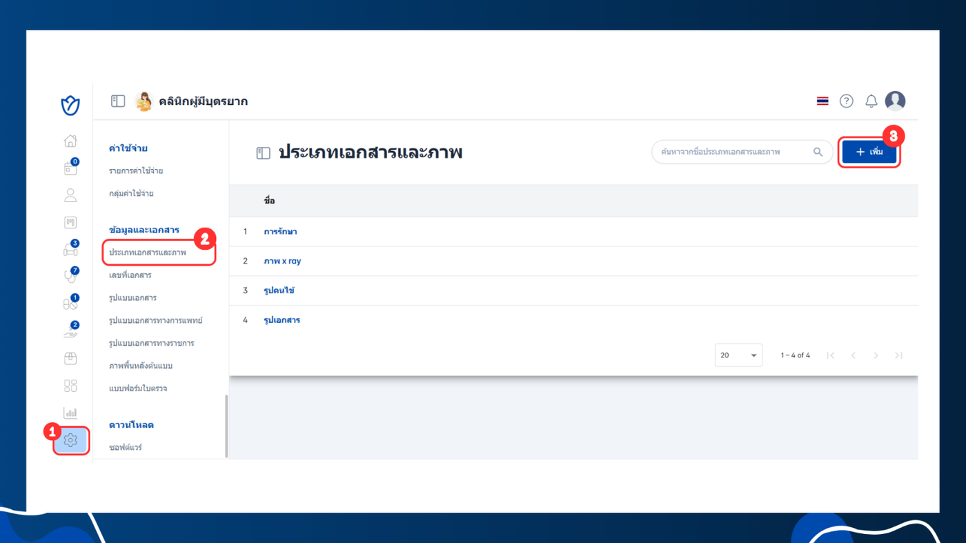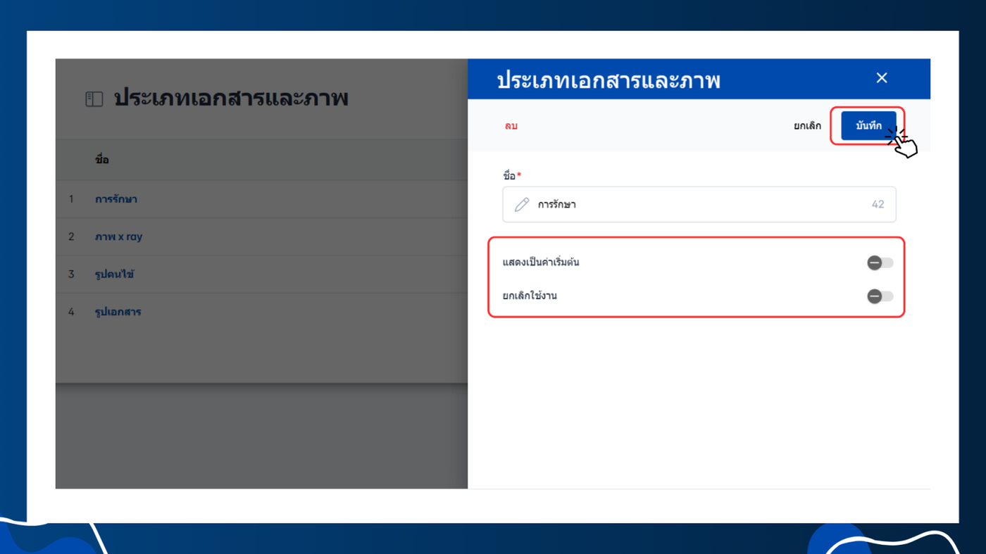 การตั้งค่าประเภทเอกสารและรูปภาพนั้น การตั้งค่าที่ส่งผลกับระบบบันทึกข้อมูล รูปภาพ หรือ ไฟล์เอกสาร ต่างๆ ที่ผู้ใช้งานอัพโหลดระบบจะจัดประเภทตามที่ผู้ใช้งานเลือกและตั้งค่า
