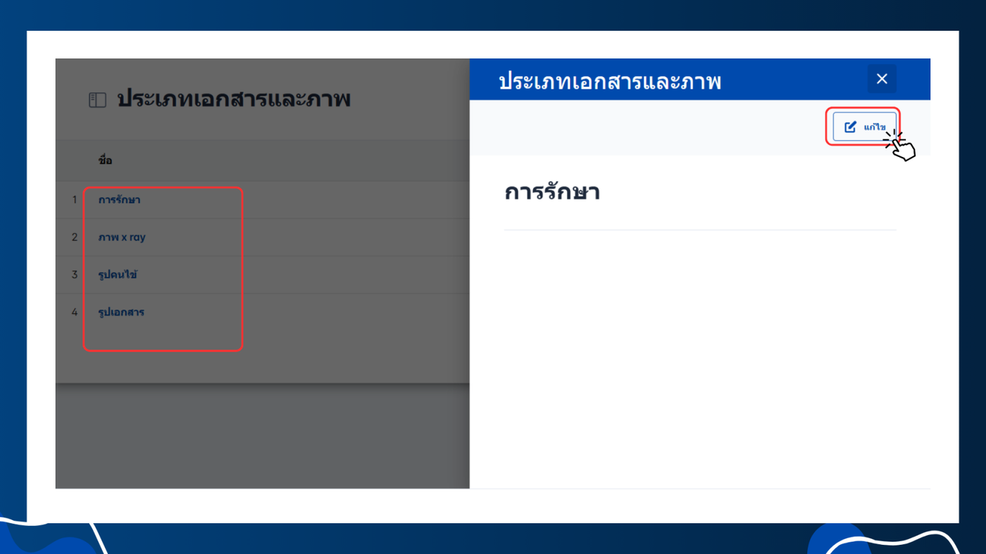 - เลือกประเภทเอกสารและภาพที่ต้องการแก้ไข จะมีหน้าต่างแสดงข้อมูลขึ้นมา กดแก้ไข