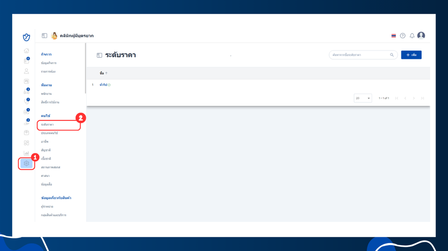 การตั้งค่าระดับราคาคนไข้จะใช้ในการเลือกระดับราคาของคนไข้ในขั้นตอนการเพิ่มหรือแก้ไขข้อมูลคนไข้ โดยระดับราคานี้จะช่วยในการตั้งราคาสินค้าหรือบริการที่เหมาะสมกับแต่ละประเภทของคนไข้ในการจัดการสินค้าและบริการ