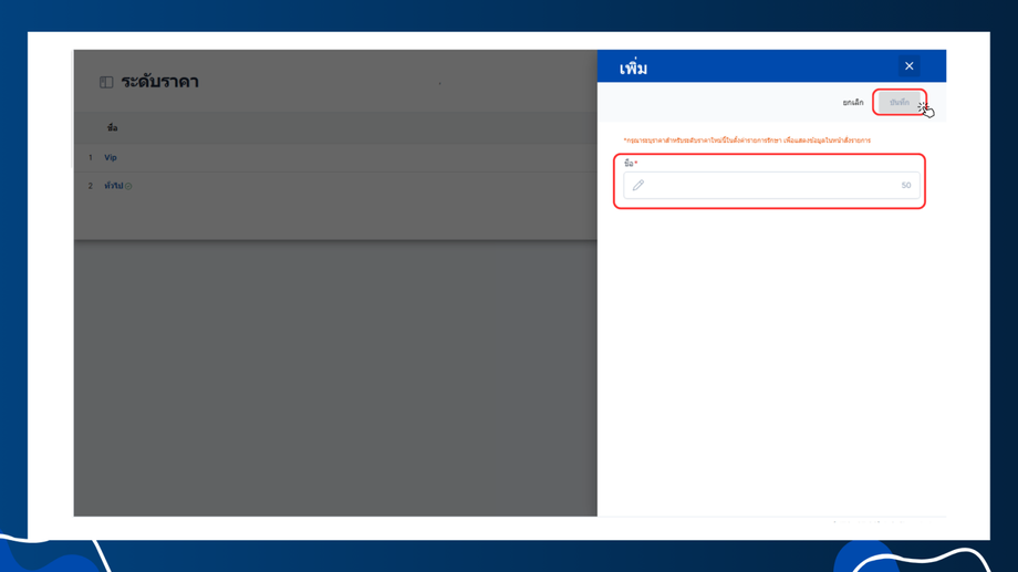 - กรุณาระบุราคาสำหรับระดับราคาใหม่นี้ เพื่อให้สามารถแสดงข้อมูลในหน้าสั่งรายการได้