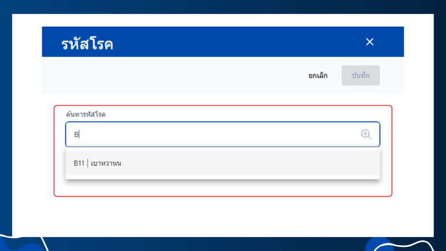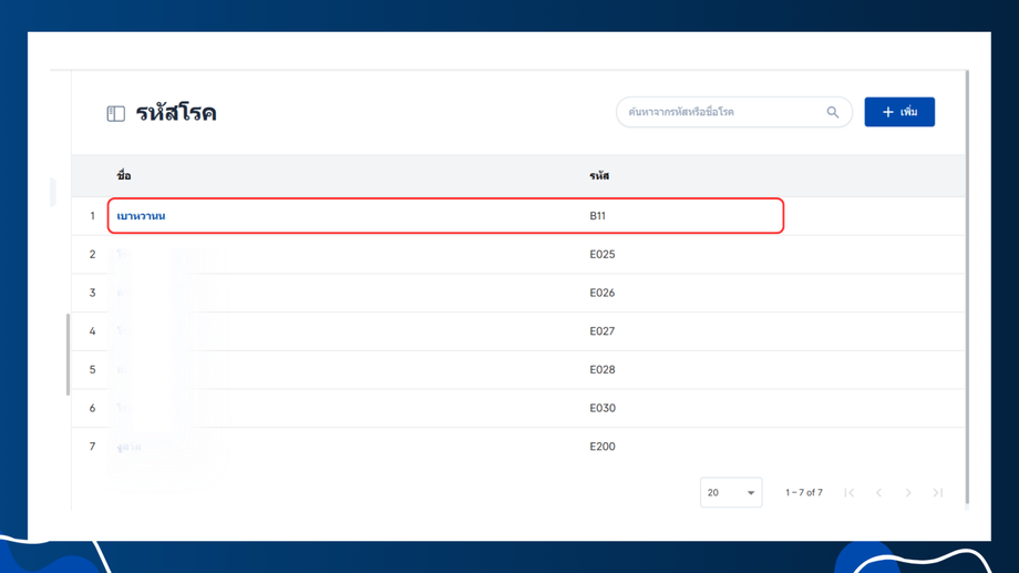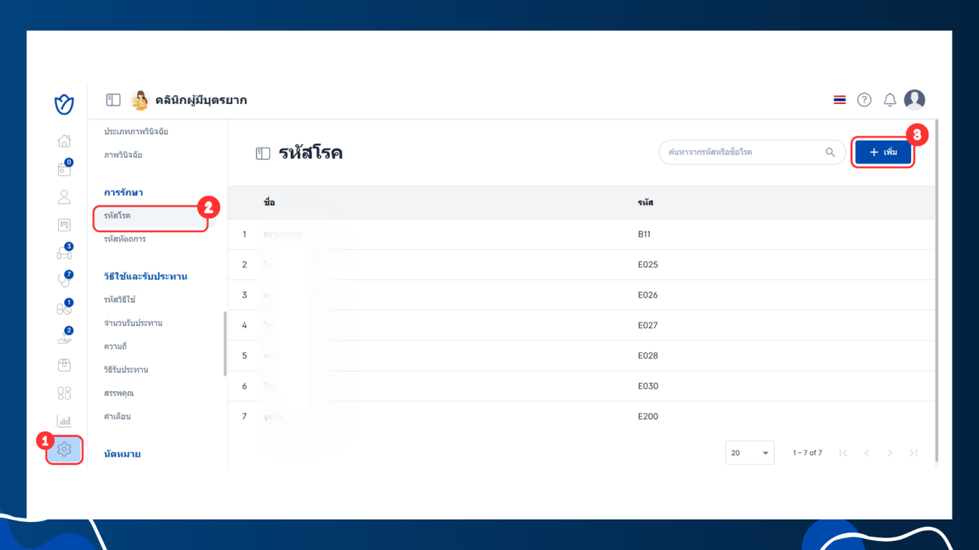 การตั้งค่ารหัสโรค เป็นการตั้งค่าเพื่อใช้งานในห้องตรวจรักษาและจะอยู่ส่วนรหัสการรักษา เมื่อผู้ใช้งานต้องการใส่ข้อมูลรหัสโรคกับผู้ป่วยระบบจะแสดงรายการรหัสโรค
