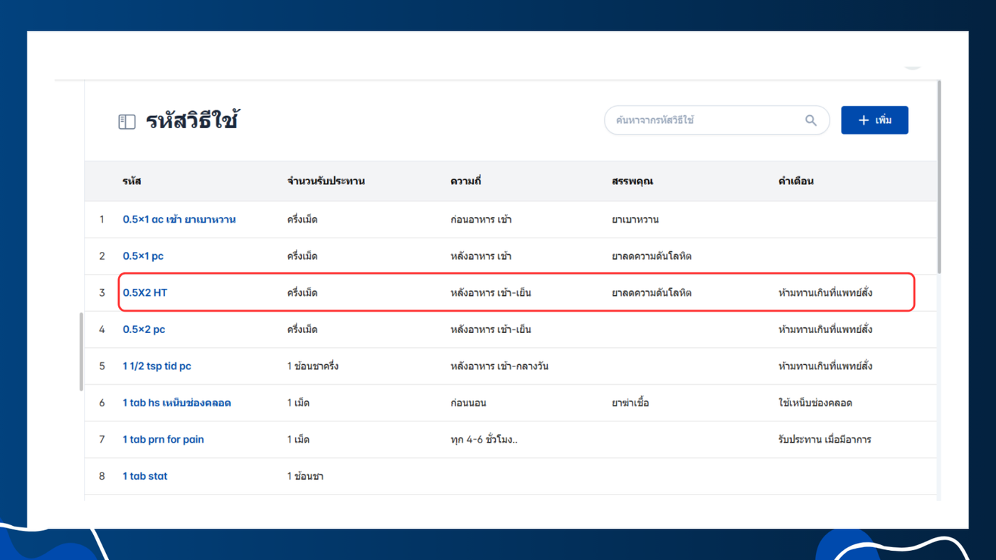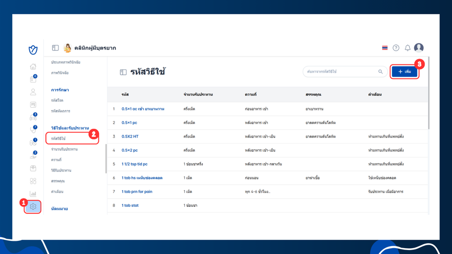 - เลือกวิธีใช้และการรับประทาน > รหัสวิธีใช้