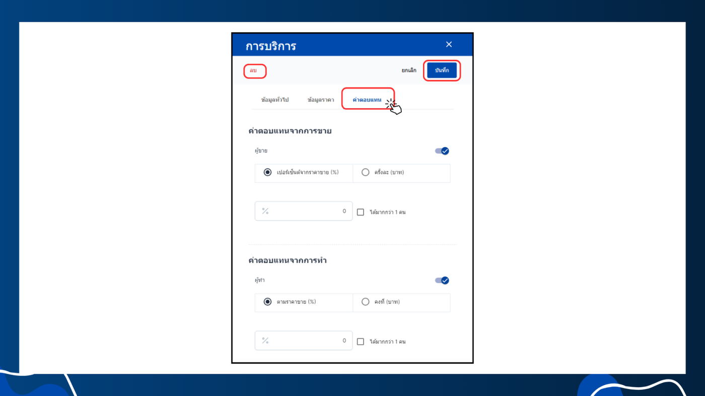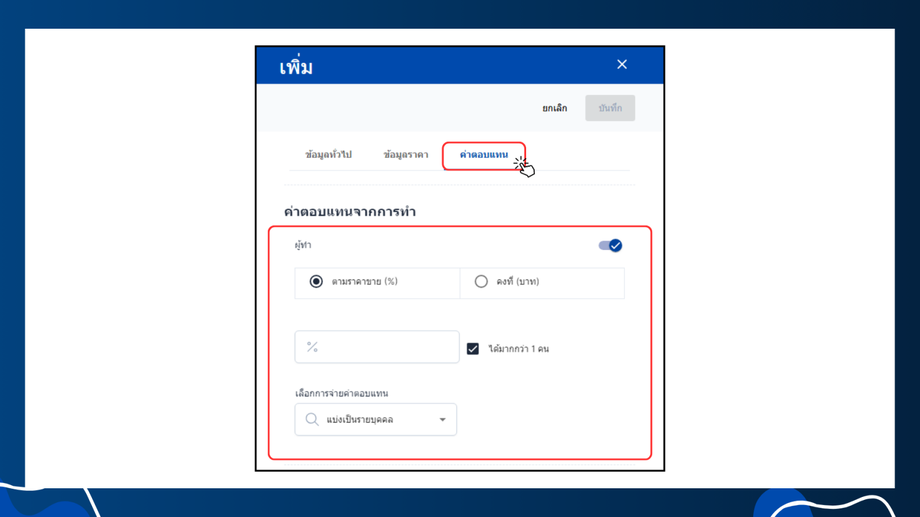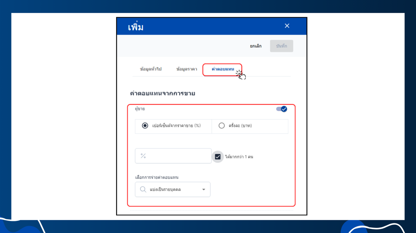 - เลือกรูปแบบค่าตอบแทน เช่น เปอร์เซ็นต์ (%) หรือจำนวนเงิน (บาท)