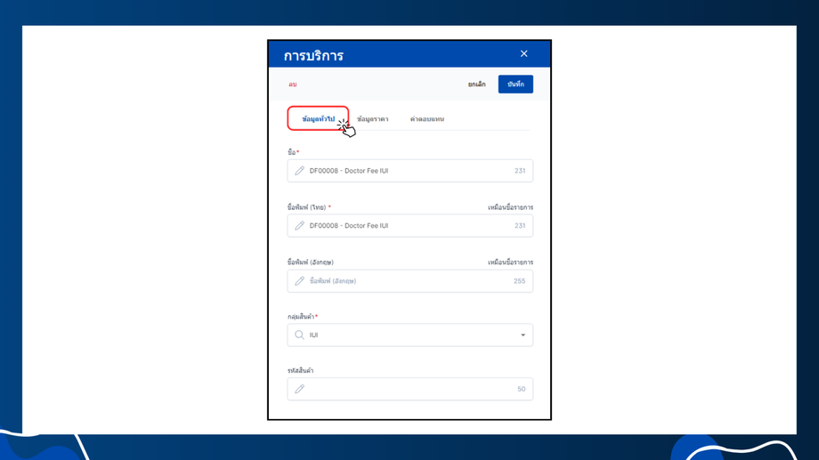 - ชื่อพิมพ์อังกฤษ: ชื่อบริการที่จะแสดงในการพิมพ์ (ภาษาอังกฤษ)