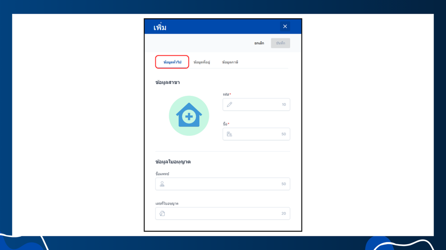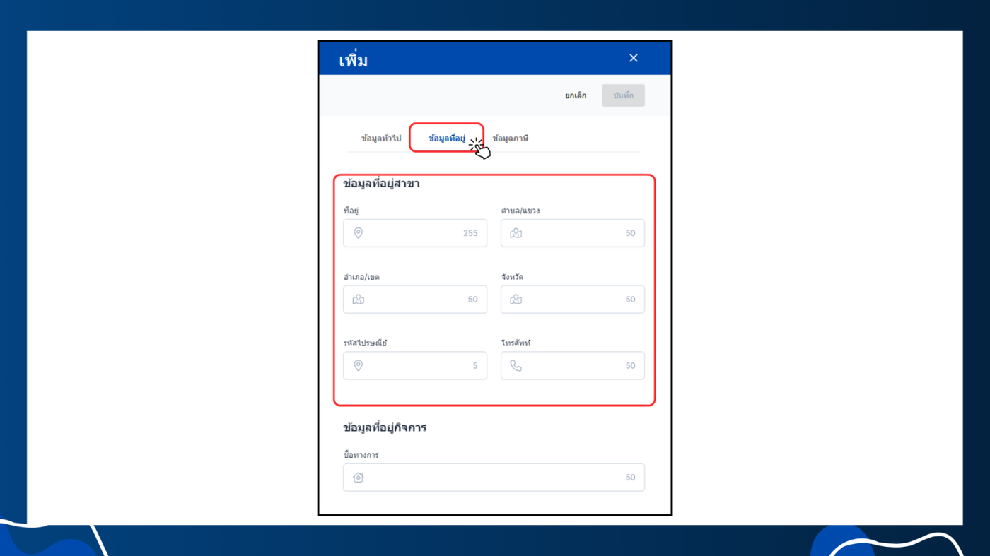 - การบันทึกข้อมูลเมื่อกรอกข้อมูลทั้งหมดเสร็จเรียบร้อยแล้ว ให้คลิก "บันทึก" เพื่อบันทึกข้อมูลสาขาที่เพิ่มเข้ามา