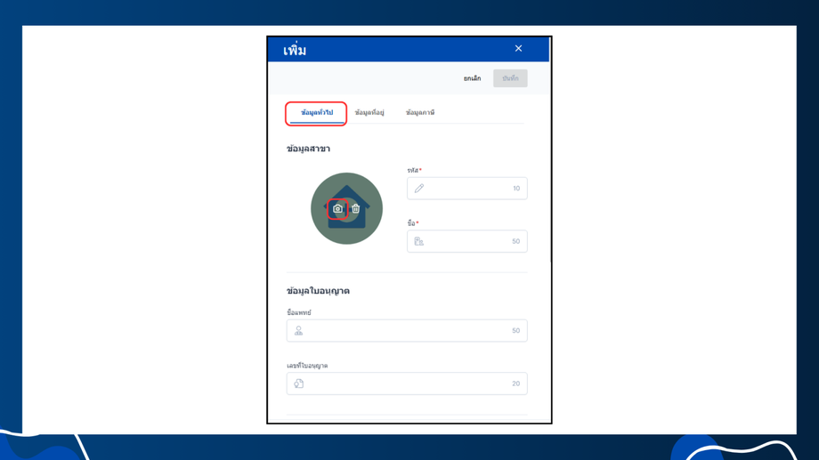 - คลิกที่รูปภาพหรือไอคอนกล้องเพื่อเลือกและอัพโหลดรูปภาพของสาขา