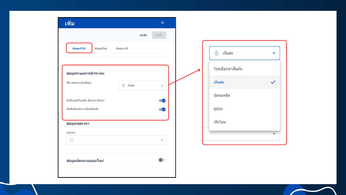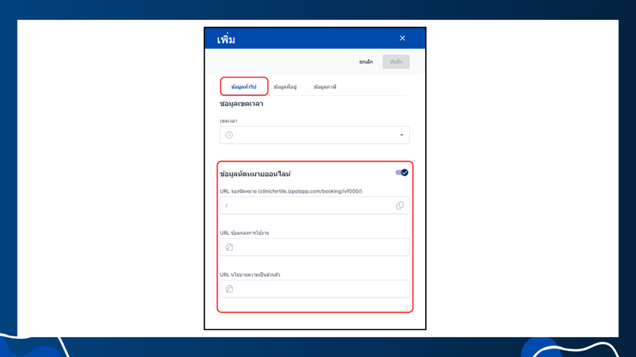 - ข้อมูลนัดหมายออนไลน์: สามารถเปิด-ปิดการใช้งานฟังก์ชันนัดหมายออนไลน์สำหรับสาขานี้ได้