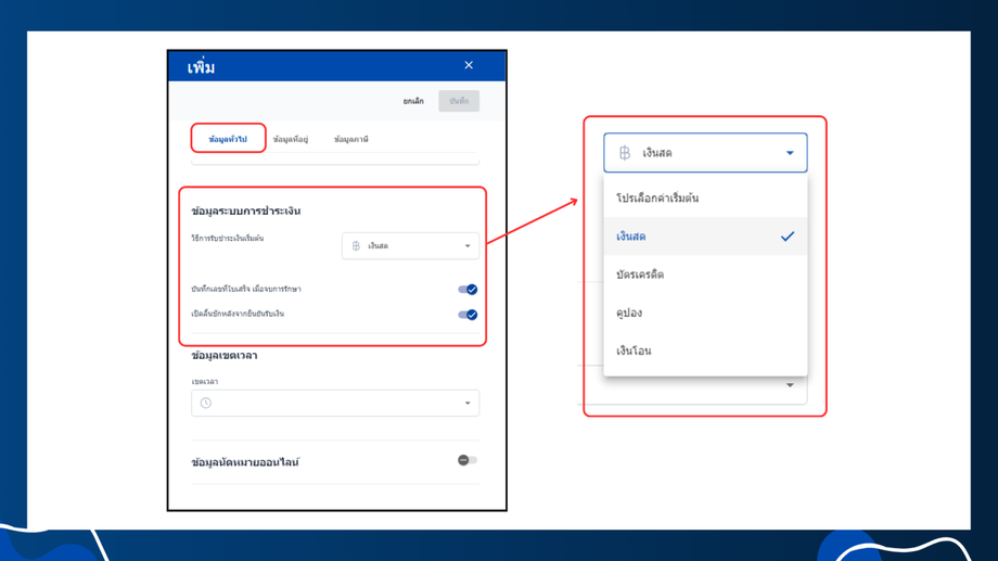 - วิธีการรับชำระเงินเริ่มต้น: เลือกวิธีการชำระเงินที่ต้องการให้เป็นวิธีเริ่มต้น