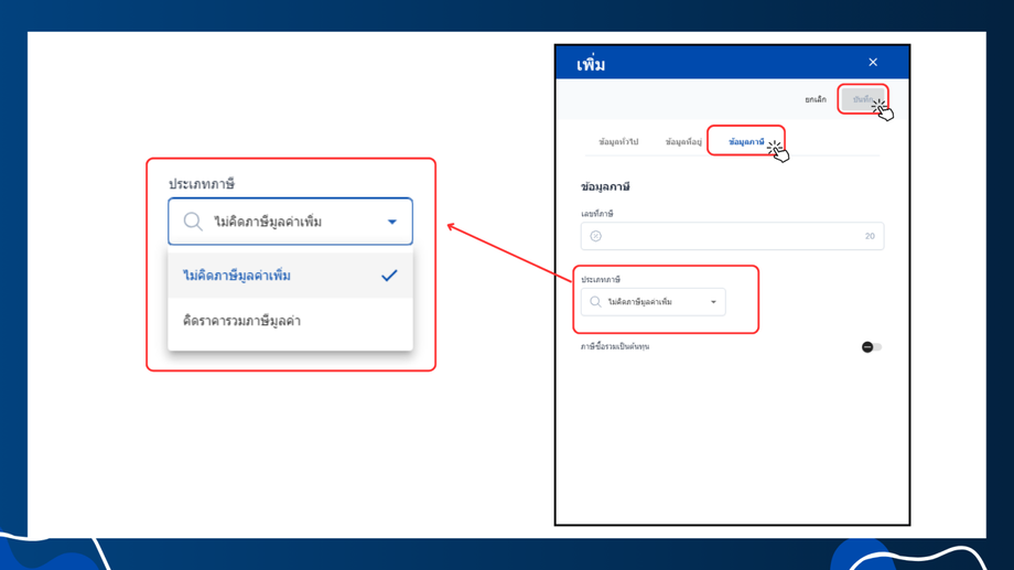 - ประเภทภาษี: เลือกประเภทภาษีที่ใช้งาน หากเลือกไม่คิดภาษีมูลค่าเพิ่มจะไม่แสดงช่องอัตราภาษี