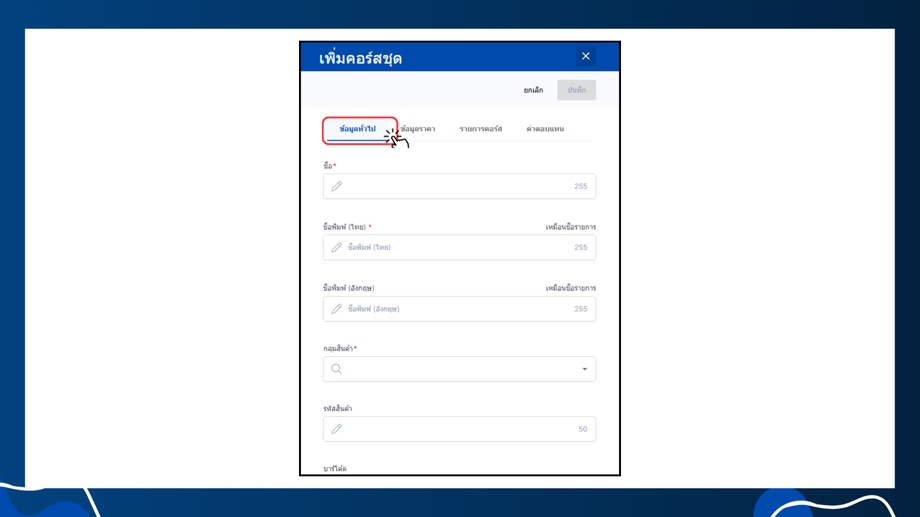 - ข้อมูลทั่วไป: กรอกข้อมูลพื้นฐานเกี่ยวกับคอร์สชุด เช่น ชื่อชุดคอร์ส, รายละเอียดต่าง ๆ