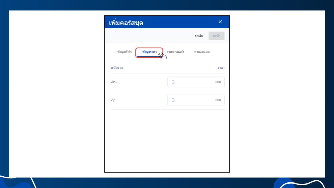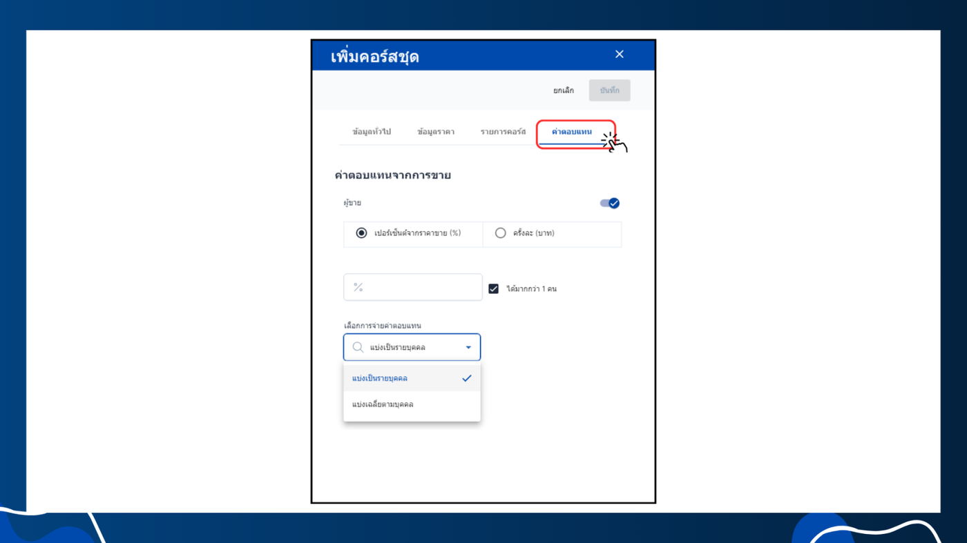- ค่าตอบแทน: เลือกผู้ที่จะได้รับค่าตอบแทนในคอร์สชุด และเลือกวิธีการจ่ายค่าตอบแทน (แบ่งตามบุคคล หรือเฉลี่ยตามบุคคล)