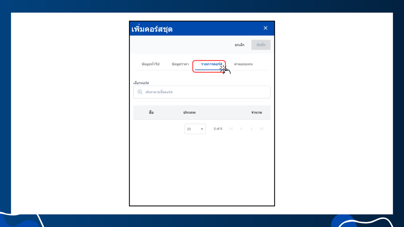 - รายการคอร์ส: ระบุข้อมูลเกี่ยวกับรายการคอร์สที่อยู่ในชุดนั้น ๆ