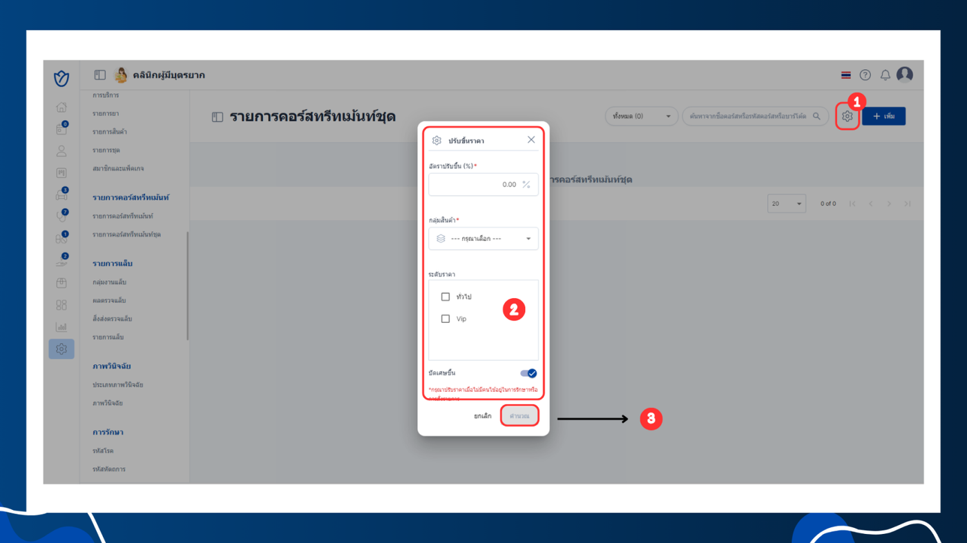 สามารถปรับราคารายการคอร์สทรีทเม้นท์ชุดได้ทั้งหมดโดยเป็นอัตราปรับขึ้นแบบ %