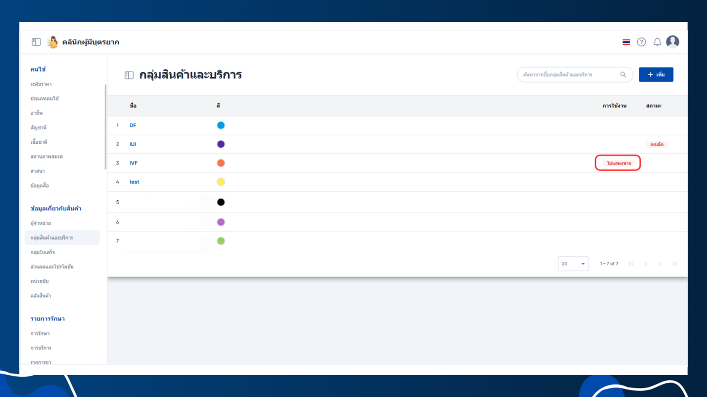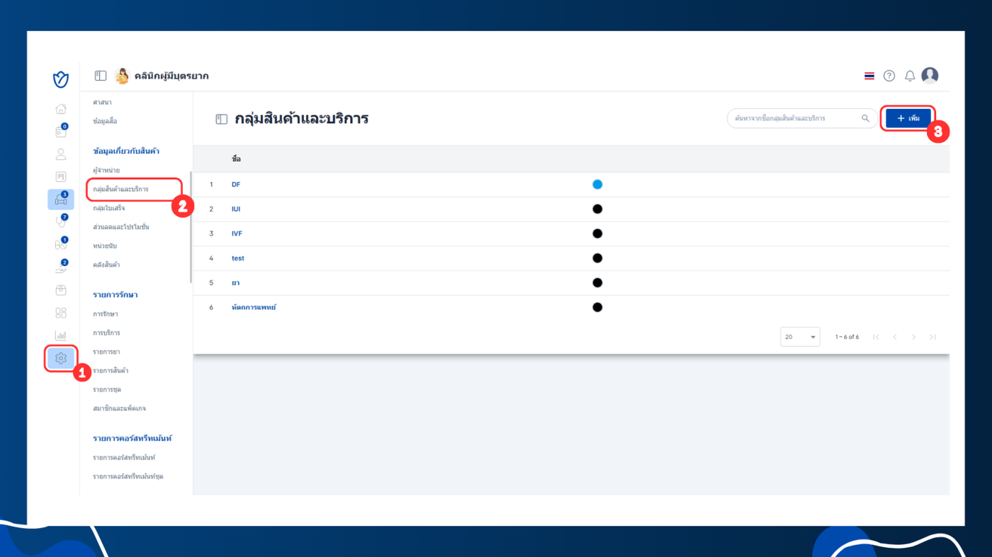 การตั้งค่ากลุ่มสินค้าและบริการจะช่วยให้ผู้ใช้งานสามารถจัดหมวดหมู่สินค้าและบริการได้ เพื่อให้การเลือกสินค้าและบริการในระบบสะดวกและรวดเร็วขึ้น โดยกลุ่มสินค้าจะอยู่ในรายการรักษา การรักษา การบริการ รายการยา รายการสินค้า รายการวัคซีน รายการชุด และสมาชิกและแพ็คเกจ